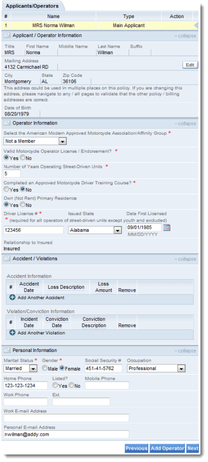 Complete the Operator Information, Accident/Violations and Personal Information forms.