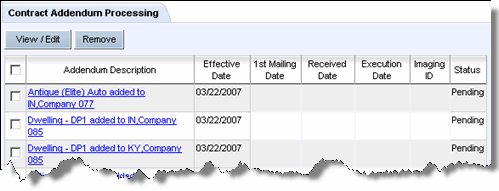 The Contract Processing page refreshes with the addenda removed.