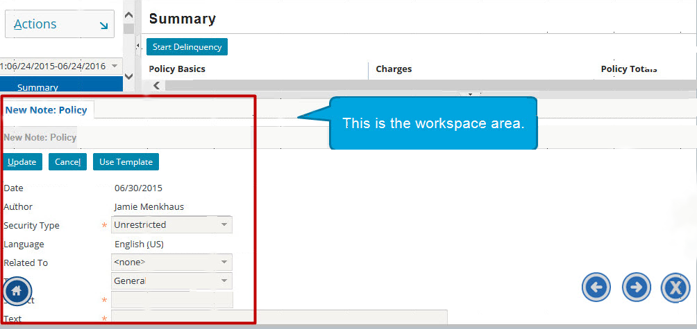 Many of the data entry pages accessed through the Actions menu are displayed in the workspace area of your screen.